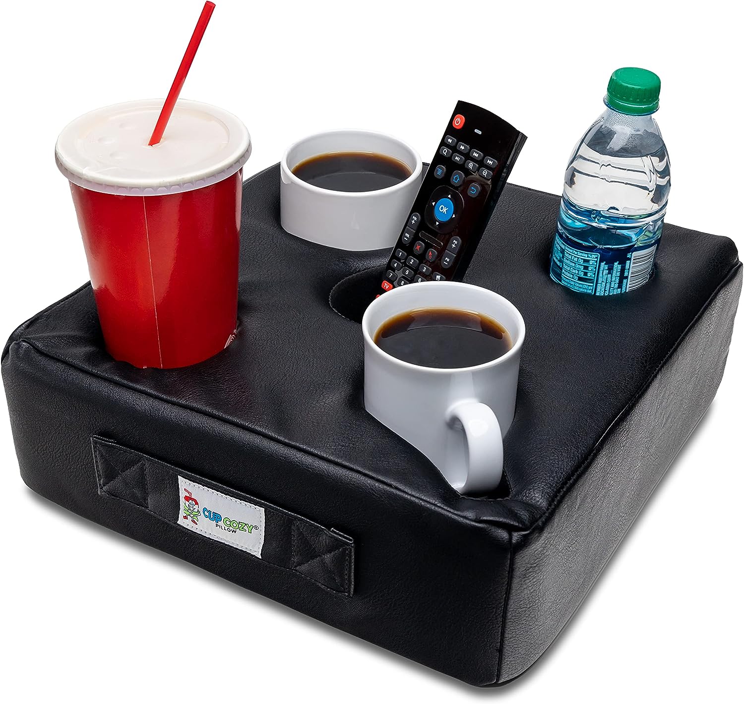 The wipeable removable cover makes cleaning a snap. It's where your drinks want to go! It's the Cup Cozy Pillow!