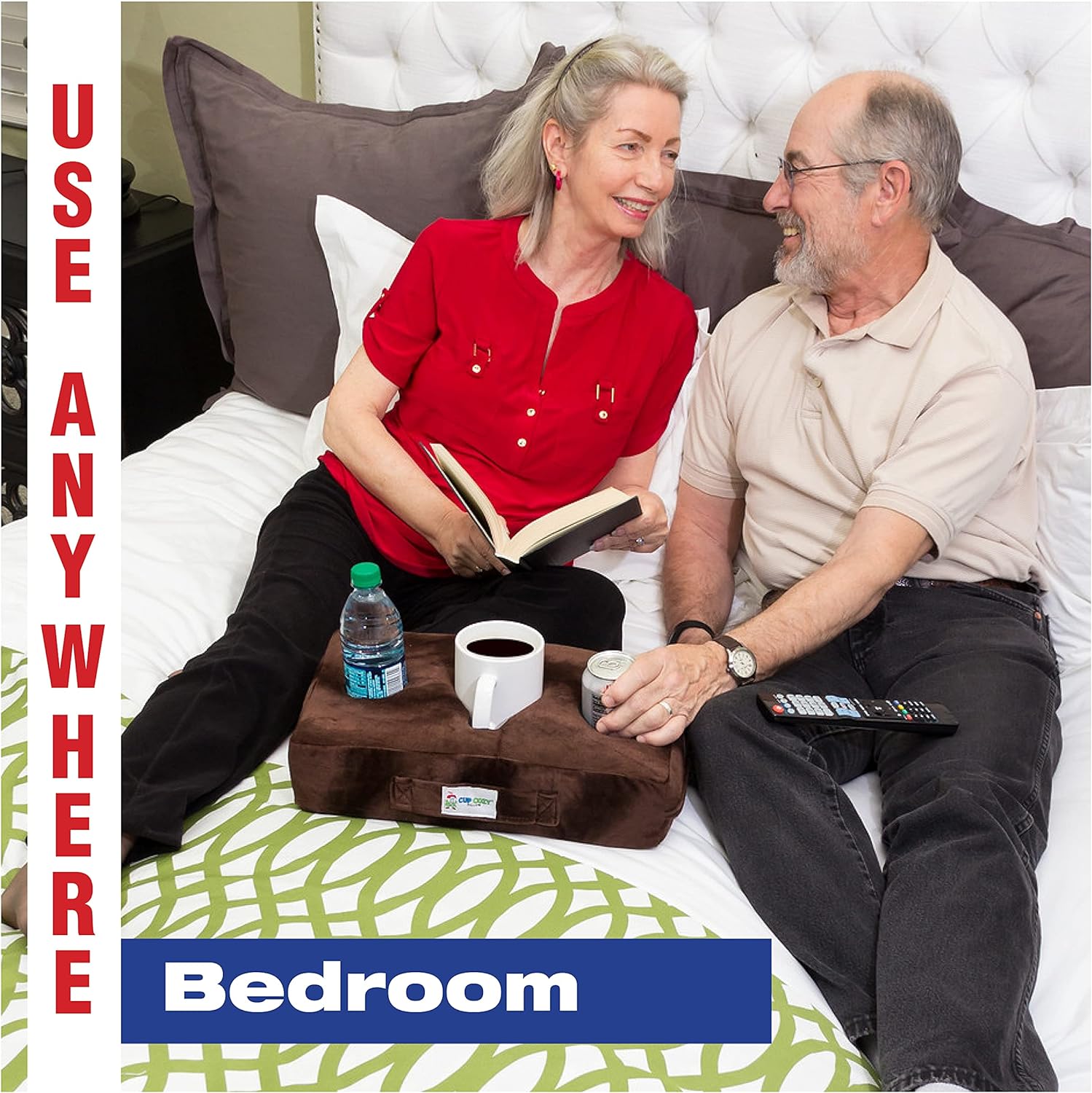 But, the Cup Cozy Pillow isn't "just" a cupholder, rather an all in one "caddy of convenience" to hold your snacks, reading glasses, remotes, and more.